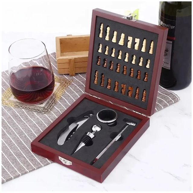 Este Kit Vinho é perfeito para os amantes de vinho, composto por 4 peças indispensaveis para aqueles momentos que bebem um otimo apreciamento da bebida, e além disso um brinde exclusivo com peças de xadrez